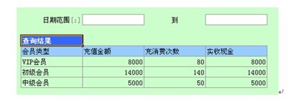 充值统计是一个纯查询模板,表样如下图。在查询条件处输入日期范围后,系统自动统计该日期范围内每个会员类型的充值数据。不输入日期则忽略该查询条件。