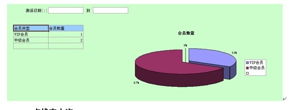 会员分类统计是一个含有图表的纯查询模板,表样如下图。在查询条件处输入日期范围后,系统自动统计在该日期范围内激活会员卡的每个类型的会员数,并在右侧用饼图表示其比例。不输入日期则忽略该查询条件。