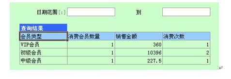 消费统计是一个纯查询模板,表样如下图。在查询条件处输入日期范围后,系统自动统计该日期范围内每个会员类型的消费数据。不输入日期则忽略该查询条件。