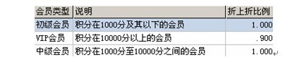 本系统设定了三种类型的会员:初级会员、中级会员、VIP会员。不同的等级享受不同的折上折比例。详情见下图: