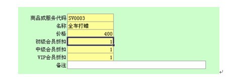 商品和服务模板用于保存可供会员消费的商品和服务的代码、名称、价格以及不同类型的会员可享受的折扣,如下图所示。系统默认会员折扣为1,即不打折。