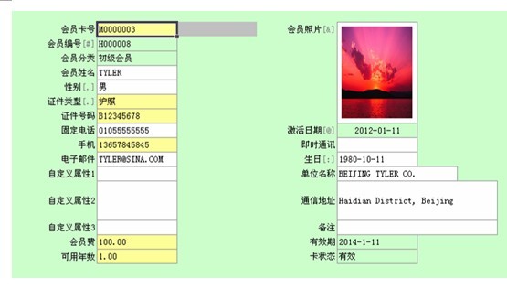 用户可使用“会员卡”模板来激活会员卡。激活会员卡时,系统将自动为该会员生成 一个唯一的会员编号。在此步骤,用户须录入卡号、持卡人姓名、证件号码、手机号码以及交纳会员费的金额(如免除会员费,可以输入0),其它信息和图片可以选择输入。用户可以自己设置该卡片的可用年数,录入后系统将自动计算卡片的有效期(从当前日期开始计算)。