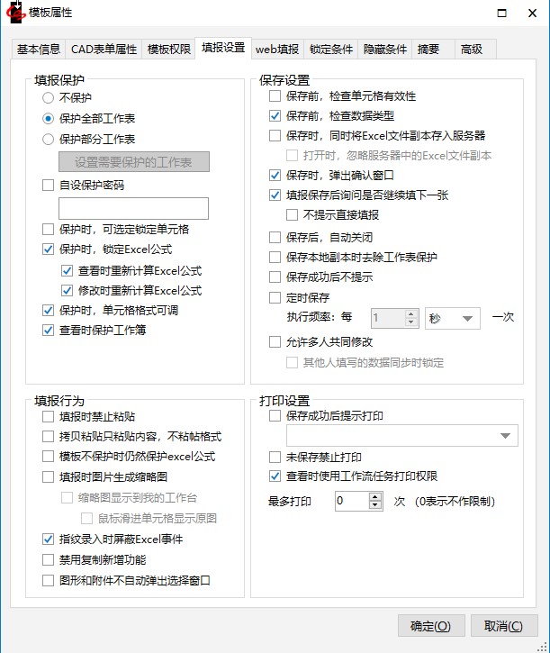 查看时保护工作薄:勾选时则在我的工作台查看表单的时候,表单被保护。不勾选,则在我的工作台查看表单时,表单不受保护,此时可以修改,但是不能保存修改内容。