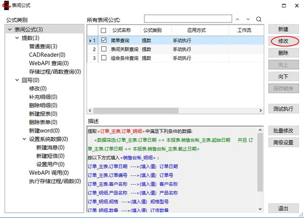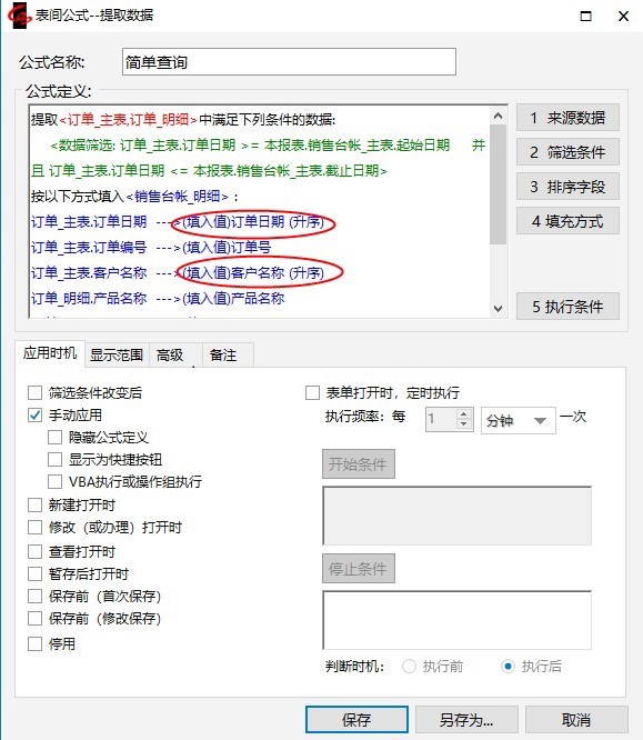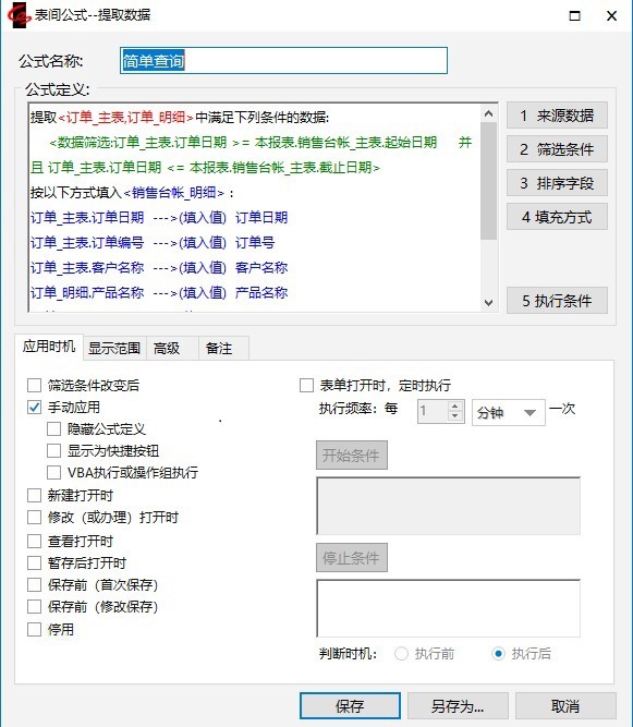 注意:它们和我们以前定义的表间公式相比有了两点不同:1)来源数据是两个表;2)填充方式中有的字段从订单_主表中取值,有的从订单_明细中取值。