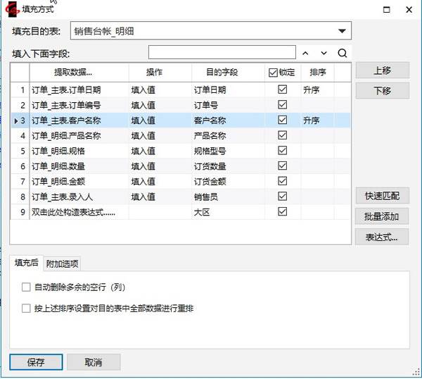 我们可以设置表间公式结果的排序方式。假设我们希望归集到销售台帐中的订单信息按订单日期由早到晚排序,同一天的订单按客户名称排序,可以这样做: