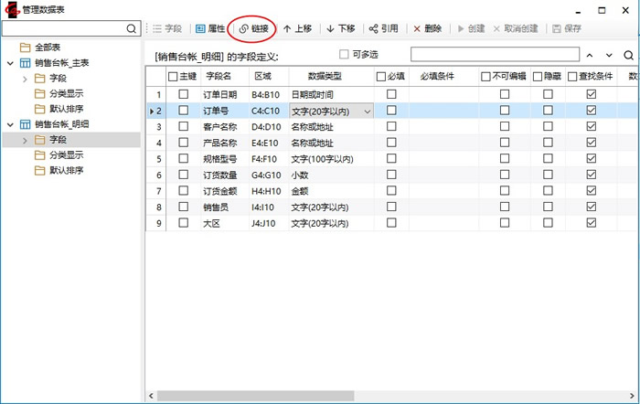- 选中“订单号”字段,点击工具栏按钮【链接】。