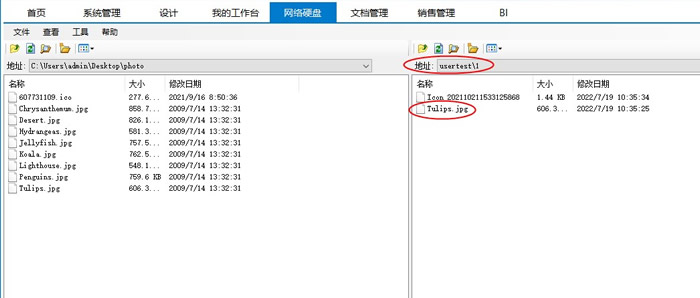 例如:要链接到下图所示的网络硬盘文件:“Tulips.jpg”,可将地址“usertest\1\Tulips.jpg”中 “usertest”写入“网络硬盘地址”;“\1”写入“网络硬盘部分地址参数”;“Tulips.jpg”填写到表单对应单元格中。
