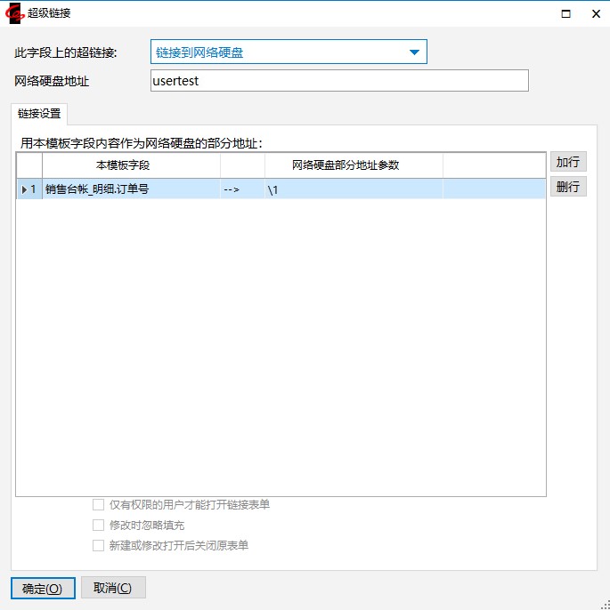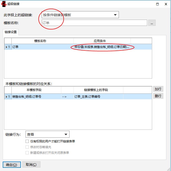 注意:当下拉选择“按条件链接到模板”且只选择了一个模板名称时,必需输入应用条件,表示链接字段满足条件时才启用超级链接功能。