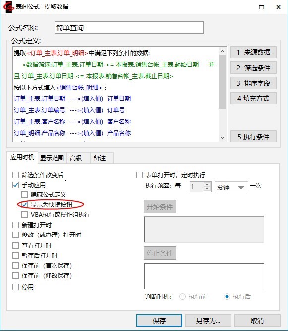 若希望快捷执行手动应用公式,则需要在表间公式的【应用时机】-【手动应用】下勾选【显示为快捷按钮】。