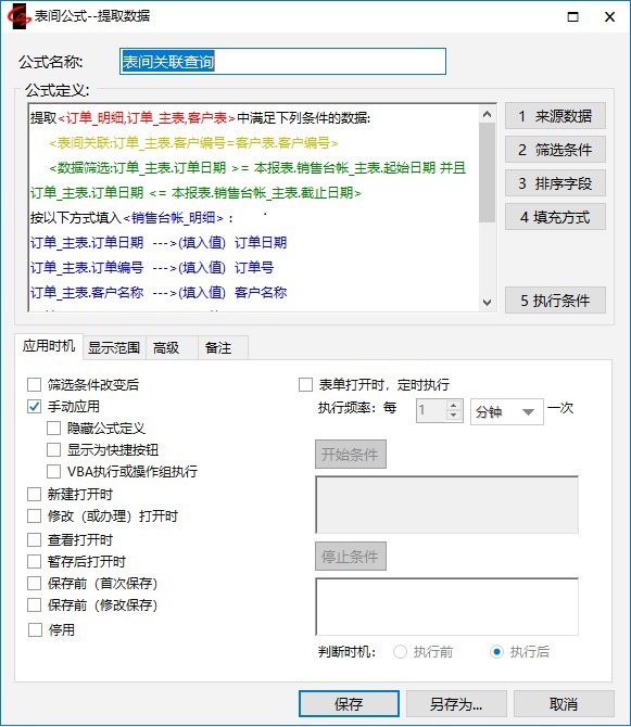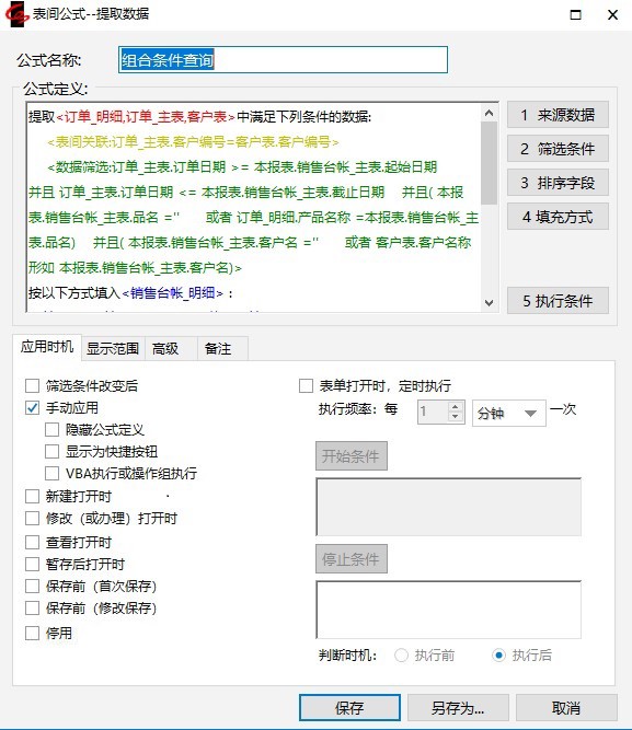 2.把已经定义的表间公式“表间关联查询”另存为一条新公式“组合条件查询”。