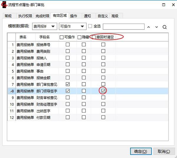 3.切换到“有效区域”标签页,选中“部门审批意见”、“部门领导签字”,如下图: