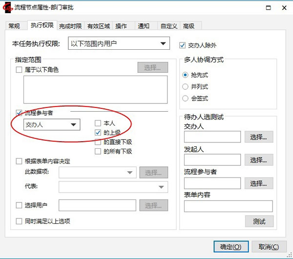 4.切换到“执行权限”标签页,在本任务执行权限右侧的下拉中选择“以下范围内用户”,然后在指定范围中勾选“流程参与者”,下拉列表中选择“交办人”,勾选其右侧的“的上级”。