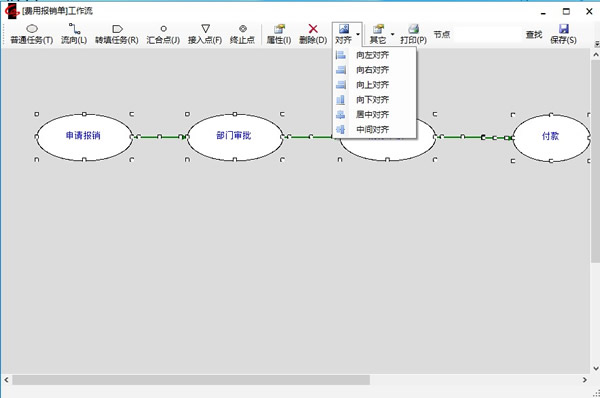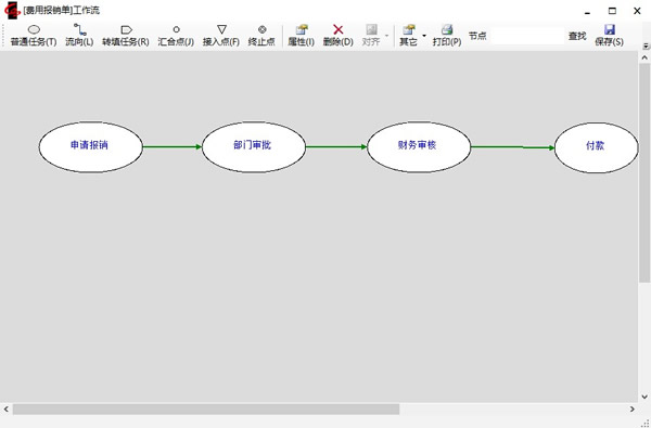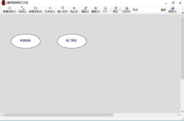 5.按【确定】,完成“申请报销”任务的定义,对话框关闭,回到工作流画板,会看到椭圆形中的文字变成了“申请报销”,如下图所示: