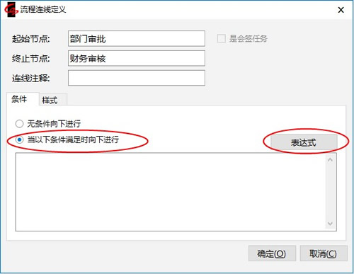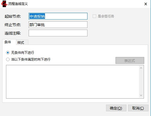 - 单击【流向】按钮,鼠标移到画板上,鼠标形状变成一个向上的箭头。单击一下“申请报销”任务图形,再单击一下“部门审批”任务图形,弹出“流程连线定义”对话框,如下图所示: