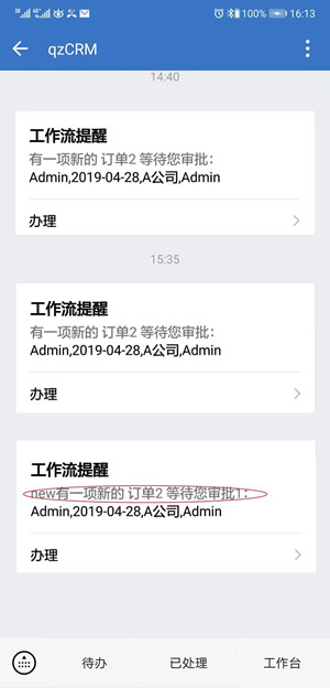 移动端的工作流提醒消息头则显示为修改后自定义的内容。