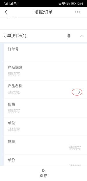 3.填报页面中点击【+订单_明细】,展开订单明细填报页面(如下图所示),点击产品名称(设置了分类显示的列表选择:“产品列表”)列表选择图标。