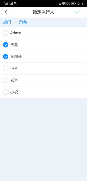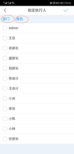 3.在图中选择部门则打开如下图所示页面,若用户仍较多,可点击【部门】或【角色】,缩小查找范围,来快速确定执行人。
