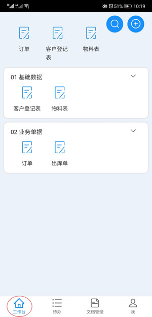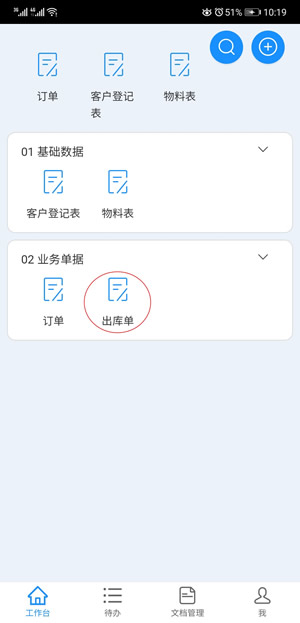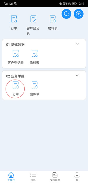 1.手机(APP)登录系统后,工作台点击订单图标。