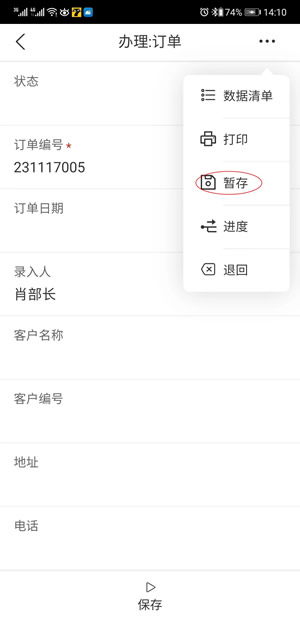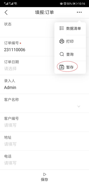 手机APP填报和办理工作流表单时可暂存表单,下面以订单的填报为例看一下如何操作暂存。办理时暂存将在15.7.3中讲解。