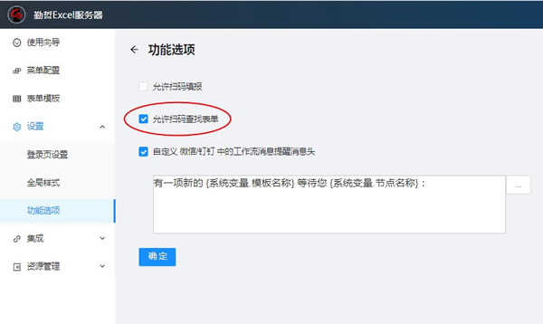 1.移动端设计页面中选中【设置】-【功能选项】,勾选“扫码查找表单”,【确定】。
