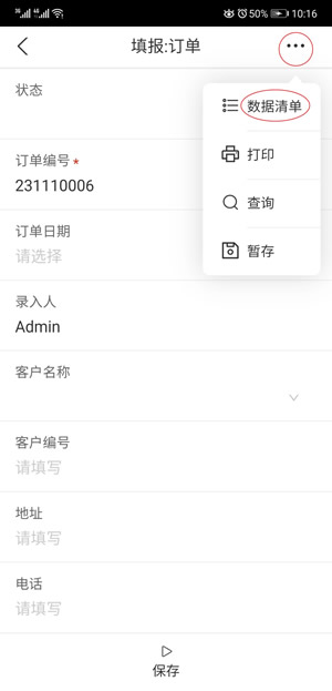 点击订单(默认视图为“填报”)图标,则在填报页面点击【…】后选择【数据清单】菜单: