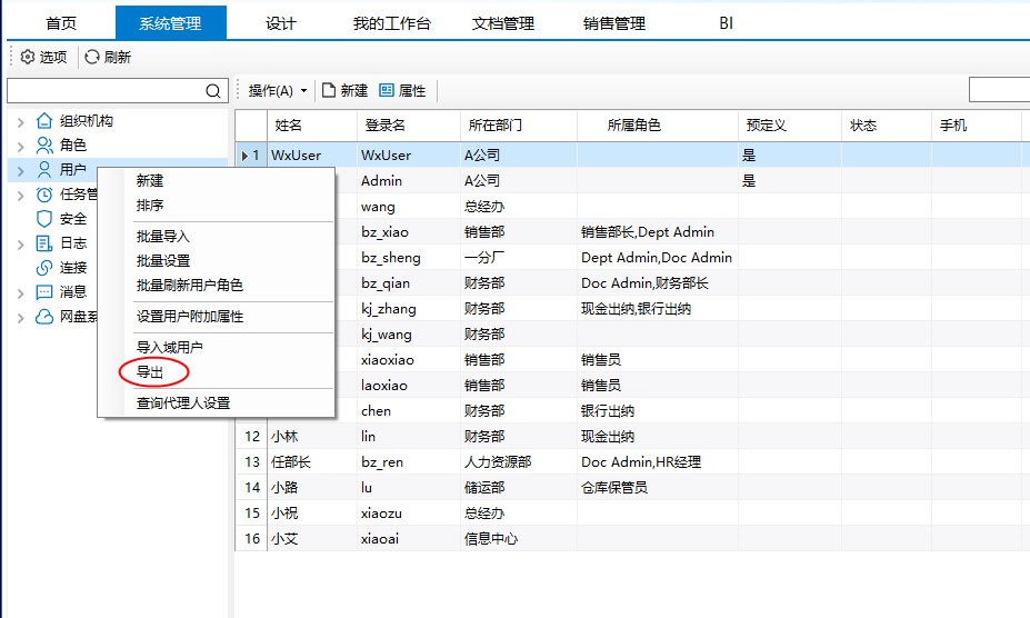 1.【系统管理】栏目下选中“用户”右键,点击【批量设置】菜单