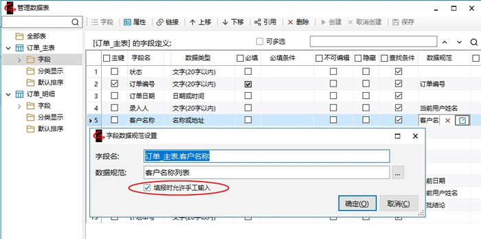 2.打开“订单“模板的管理数据表中【客户名称】字段的数据规范设置窗口,勾选【填报时允许手工输入】。