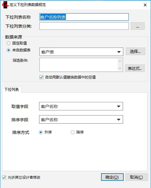 - 以设计者身份登录系统,设计栏目中【数据规范】-【下拉列表】中新建“客户名称列表”如下: