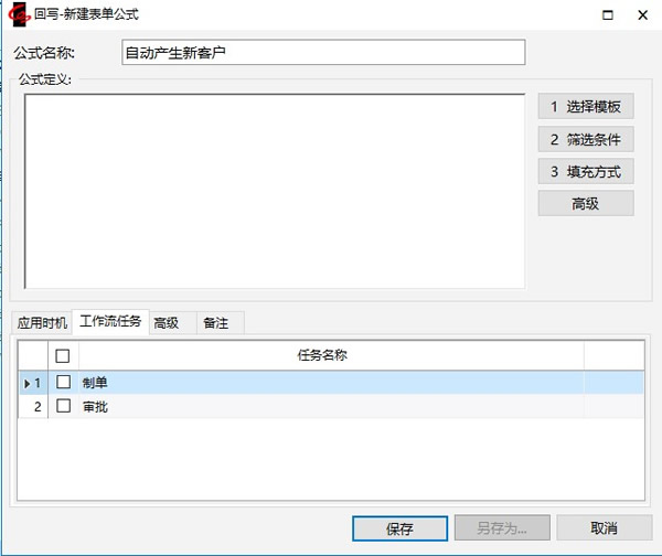 - 输入公式名称为“自动产生新客户”,应用时机为“办理保存时”,切换到“工作流任务”标签下,选择任务名称为“制单”,如图。