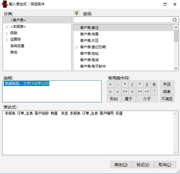 6.点击【2.筛选条件】按钮,弹出“输入条件”窗口,设置条件为“本报表.订单_主表.客户名称 有值 并且 本报表.订单_主表.客户编号 无值”,如图,点击【确定】