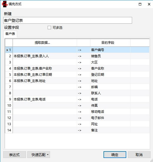 7.点击【3.填充方式】按钮,弹出“填充方式”窗口,依次选择用本报表的哪些字段填充新表单的对应字段,如图,最后点击【确定】。