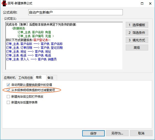 说明:若本报表中提取的数据表为明细表且明细数据有重复时,新建的表单又不能有重复数据时,应该如何设置新建表单公式呢?我们可以如下图所示,选择【高级】选项卡,勾选【从本报表细表提数据时过滤重复项】。解决重复数据的问题。