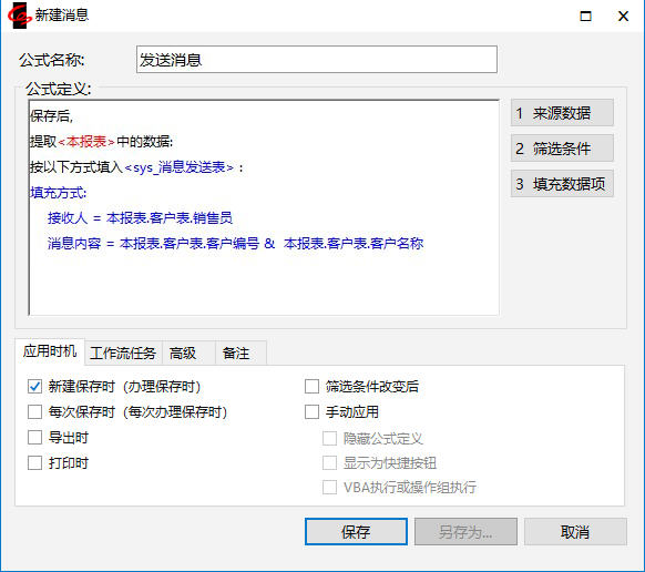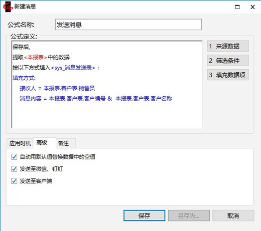 “新建消息”公式的作用是:没有工作流的表单也可生成发送消息,并且补充了原工作流完成后系统自动生成的消息,使得消息的构造更加方便灵活。下面我们以“客户登记表”为例来说明如何应用“新建消息”公式。
