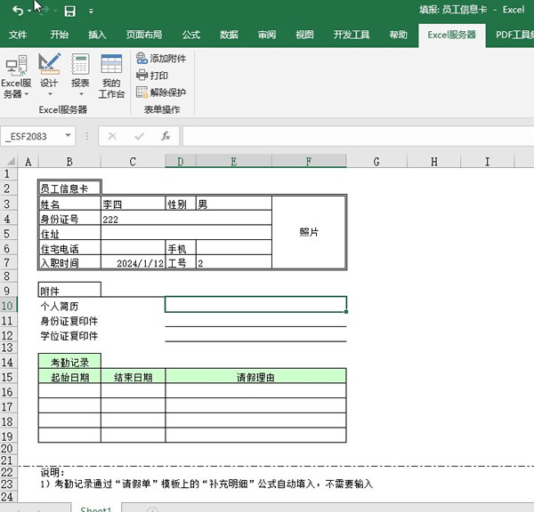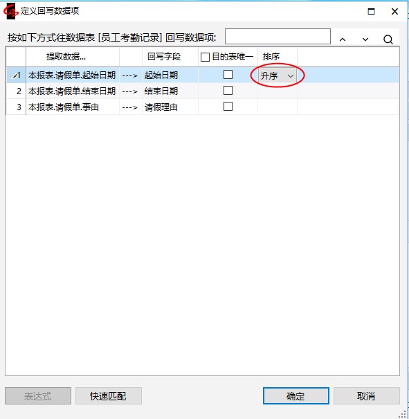 如下图所示:此时补充的数据会按“本报表.请假单.起始日期”升序顺序补充到对应的员工信息卡的考勤记录表中。