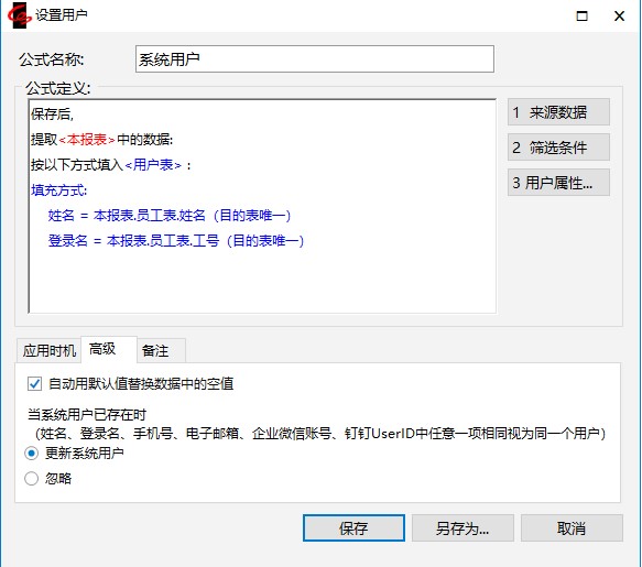 当企业用户在第三方平台(如钉钉等)进行管理时,还可通过后面将要讲解的 WebApi 将用户信息填写到模板上,在执行模板上的表间公式完成对系统用户的创建。