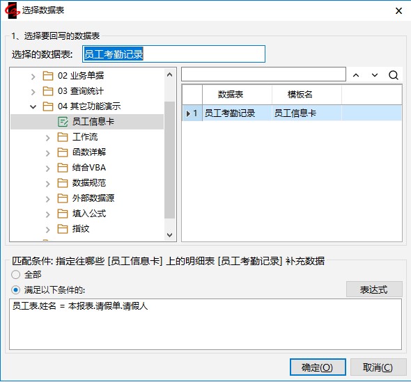 5.因为“员工信息卡”有很多张,所以还需指明要把明细记录补充到具体哪一(些)张“员工信息卡”上。在“选择数据表”窗口的下半部分,选择“满足以下条件的”,设置条件为“员工表 . 姓名 = 本报表 . 请假单 : 请假人”,即,把明细记录补充到请假人的员工信息卡上。点击【确定】,回到“回写公式”窗口。