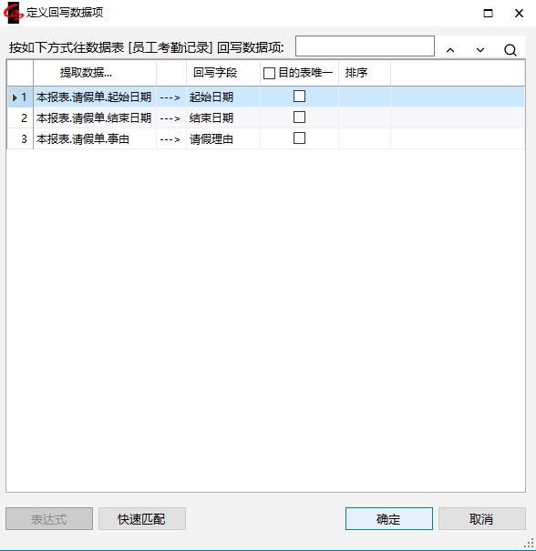 前面的例子中“请假单”要回写的数据项为单一数据项,若要回写的数据项为重复数据项(如:从“请假单”模板提取的数据项设计为重复数据项),并且用户想要将数据按顺序补充到回写数据表。我们应该如何设计呢?