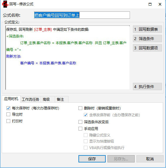 在第10章,我们学习过回写公式,它可以在保存一份表单的同时,同步更新其它表单中的数据,这是回写公式最常用的一种情况,此外,回写公式还有其他类型,本章逐一举例介绍。