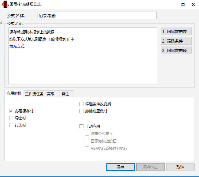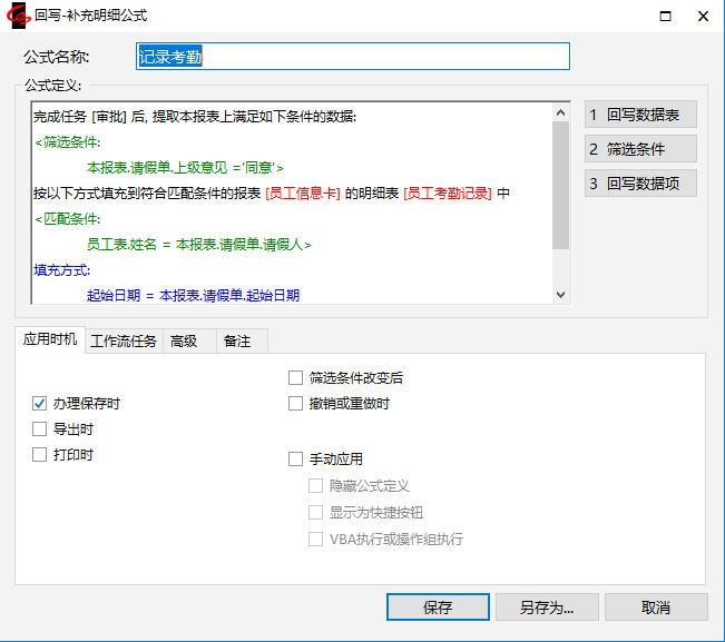 - 弹出“回写公式”窗口,输入公式名称为“记录考勤”,选择应用时机为“办理保存时”,切换到“工作流任务”标签下,任务名称选择“审批”。如图。