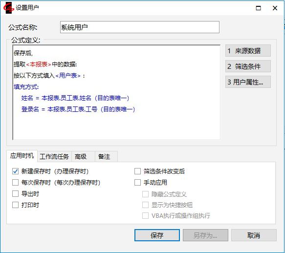 在这里我们设置新表单的填报人和本表单的填报人相同,也就是说,假如张三填报了一张订单,并输入的新的客户名称,则保存订单的时候,同时存了一份客户登记表,这分客户登记表也相当于张三填的。