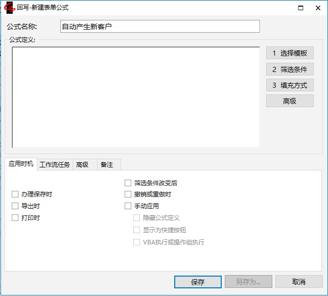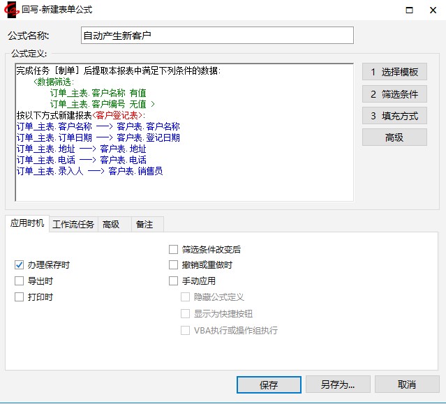 这种回写公式的作用是,保存一份表单的同时,自动新建一份其他的表单。这种类型的回写公式应用十分广泛,例如: