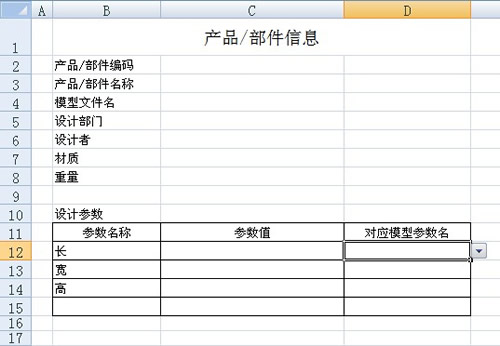 下面我们在如前图 所示的“部件信息”模板上定义一个CAD Reader,把一个Pro/E模型中定义的所有参数提取出来,在“设计参数”明细表的“对应模型参数名”那里构造下拉列表。