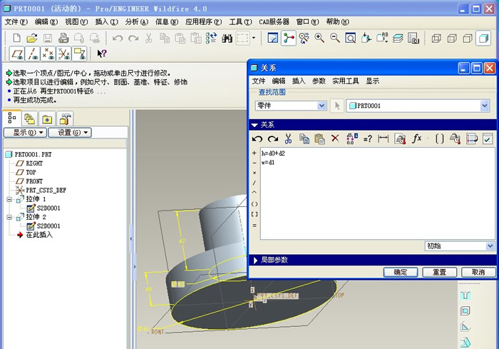 假设有如下图所示的一个Pro/E零件,其包含两个拉伸特征,拉伸长度分别是d0和d2,拉伸1的草图是一个圆,直径是d1。我们在这个模型中定义了两个实数型的参数h和w,并定义两个关系式:h=d0+d2,w=d1