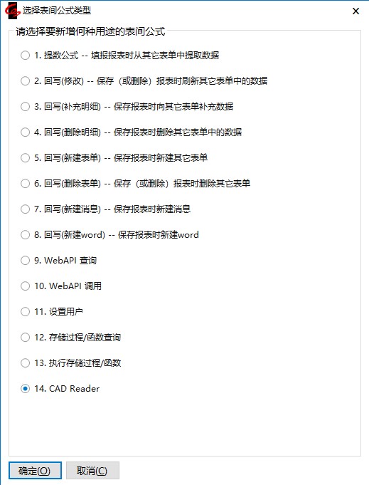 - 点击【新建】,弹出“选择表间公式类型”窗口,选择最后一项“CAD Reader”,点击【确定】。