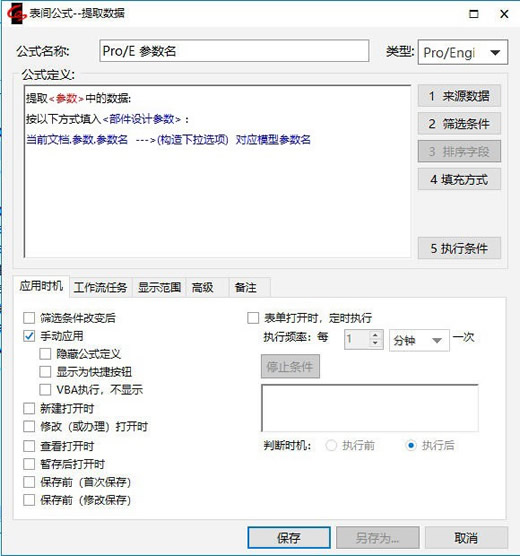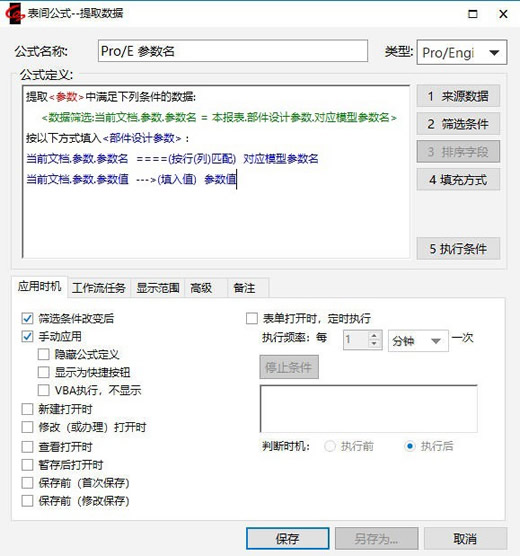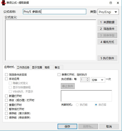 4.弹出“表间公式—提取数据”窗口,这个窗口和定义普通的提数公式的窗口几乎是一样的,只有一点小区别:在“公式名称”旁边多出来一个“类型”下拉列表,里面是Excel服务器2024 CAD版(CAD服务器2024)所支持的三种CAD软件的名称;我们这里要定义一个从Pro/E文档中提取数据的公式,所以类型选择“Pro/Engineer”;