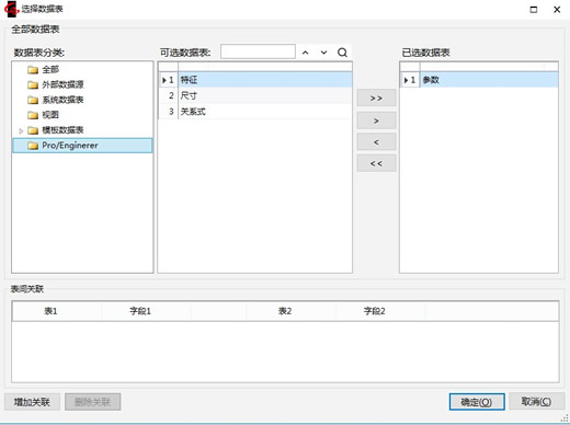 5.输入“公式名称”,点击【来源数据】按钮,弹出“选择数据表”窗口。在这个窗口上,“数据表分类”中增加了一个节点“Pro/Engineer”;点击此节点,在“可选数据表”中列出了我们可访问的四个Pro/E 中的图元表:特征、尺寸、参数、关系式;本例中,我们要提取Pro/E中的参数,所以双击“参数”,将其加入到“已选数据表”中。