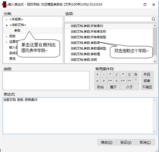 7.点击“对应模型参数名”的“提取数据…”列上的编辑图标,弹出“输入表达式”窗口,注意看在“分类”那里多了一项“<当前文档>”,下面列出的是我们在选择数据源那一步所选择的Pro/E图元表表名----参数。输入表达式为“当前文档.参数.参数名”。