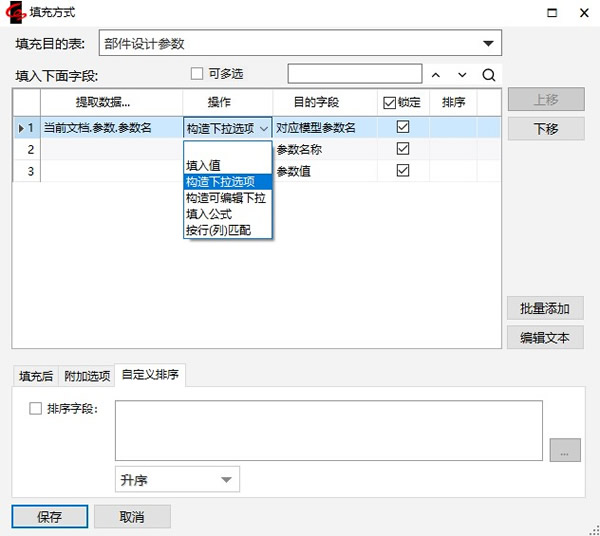 8.点击【确定】回到“填充方式”窗口。选择操作为“构造下拉选项”。点击【保存】返回到“表间公式—提数数据”窗口。