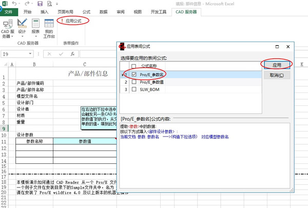 3.点击【确定】,则自动打开Excel,出现“部件信息”的填报界面。点击“Excel服务器”功能区中的按钮【应用公式】,弹出“应用公式”窗口,勾选“Pro/E_参数名”,点击【应用】按钮。