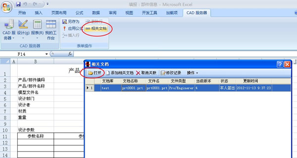 在26.3节,我们讲过可以设置文档库中的文档与表单的相关关系,当填报表单的时候,在设置了文档库的情况下,可通过点击“Excel服务器”功能区按钮【相关文档】,弹出“相关文档”窗口,选择相关文档并打开,而后,即可以应用 CAD Reader,从已打开的相关文档中提取数据,填充到表单上。